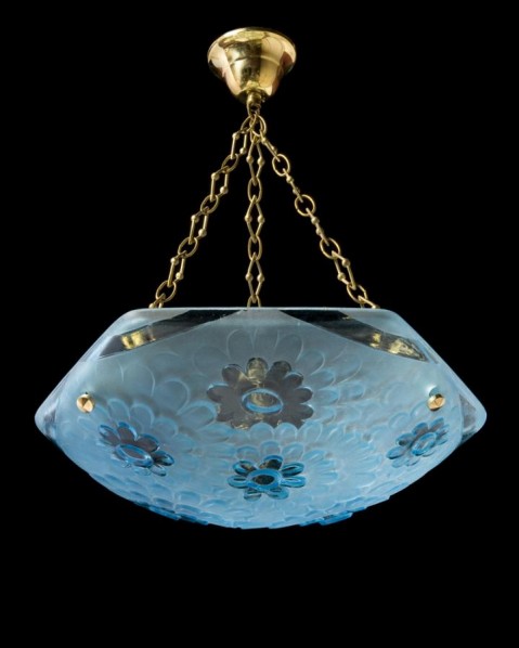 "DEGUE" Art Deco blue molded glass pendant, France, circa 1920.