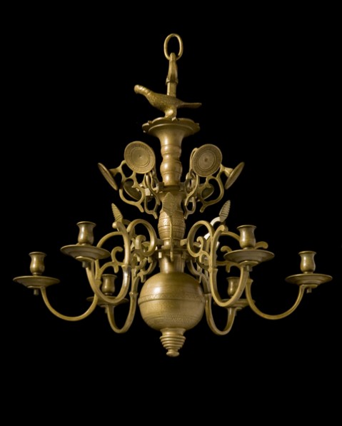 Dutch brass six-light chandelier with decorative reflectors, circa 1830