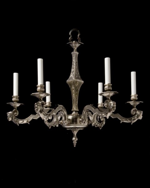 Art Deco nickeled bronze six-light chandelier, France, circa 1930
