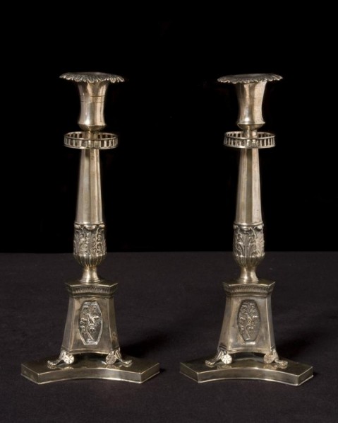 Empire style silvered bronze candlesticks, England mid 19th century.