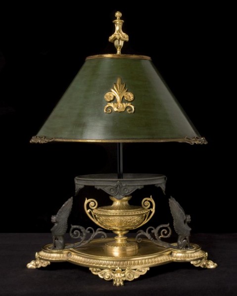 "ELKINGTON" Empire style black and gilt bronze bouillotte with painted and decorated tole shade, England, circa 1900.