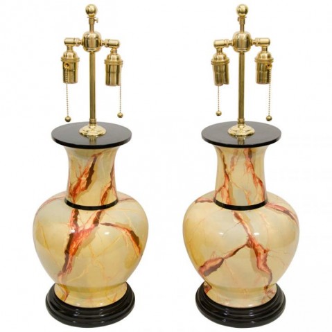 Pair Hand Thrown Pottery Two Light Table Lamps With Faux Marble Finish And Mounted on Black Lacquered Custom Bases, 20th Century.