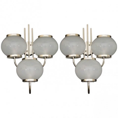Chrome And Frosted Glass Globe Three-Light Sconces, Italy Mid 20th Century.