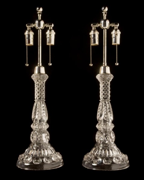 Decorated Sandwich glass lamps, American late 19th century.