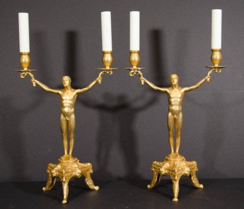 Art Deco Gilt Bronze Two Light Figural Candelabra Supported On Tripod Shaped Bases Signed "HS MUNCHEN" Circa 1930.
