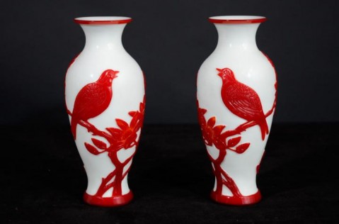 Red and white opaque Peking Glass vases with bird and leaf motif
