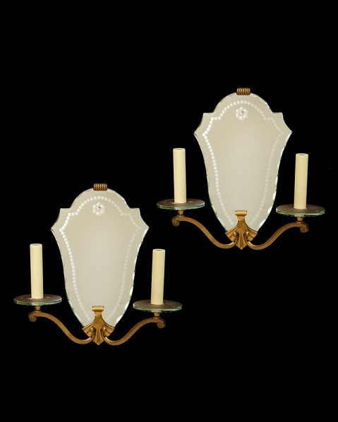 Art Deco etched mirrored back two light sconces with bronze frames and glass bobeches, France circa 1930.