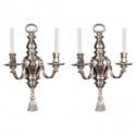 Classical style silver on copper two light sconces with lion and tassel decoration by "E.F. CALDWELL", New York circa 1900.