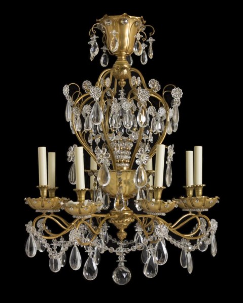 "JANSEN" Gilt Bronze and Crystal Eight Arm Chandelier. Each Bobeche Is Wired With Two Sockets Along With A Wired Lower Bowl And A Wired Center Crystal Sprays.