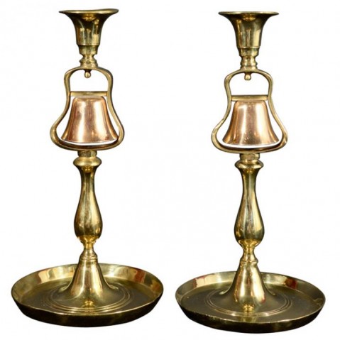 Pair of turned brass one pub light candlesticks with bar maid call bells. Can be wired as lamps, England, 19th century