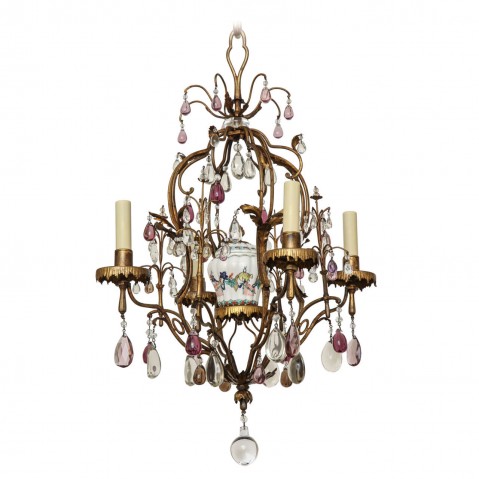 "BAGUES" gilt bronze and tole four light chandelier with porcelain chinoiserie urn and clear and amethyst crystal sprays, France