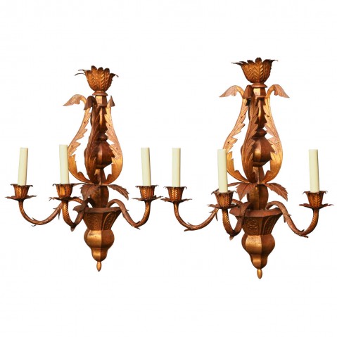 Gilded tole three light sconces with arms supported by a central urn and decorated with exaggerated acanthus leaves, Italy 19th century.