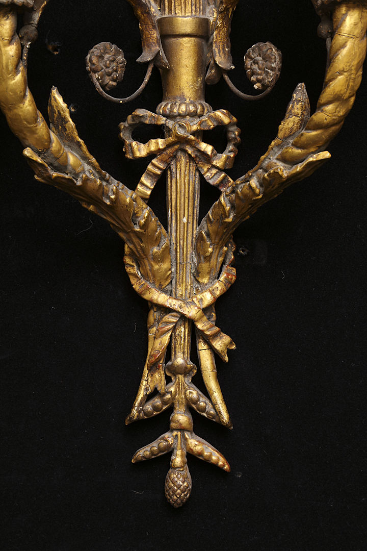 Pair of Louis XV style giltwood, gesso and iron two-light sconces. France, circa 1870