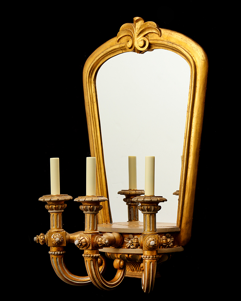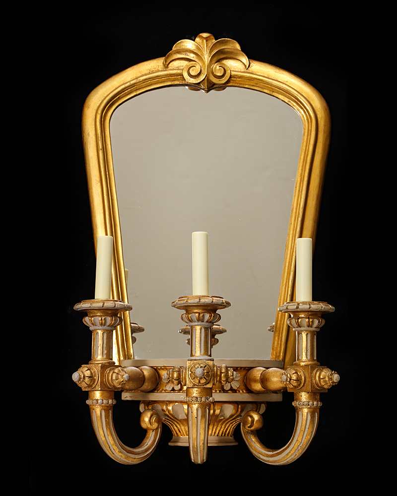 ART DECO Giltwood and gesso three light mirrored back sconces, Italy circa 1930.