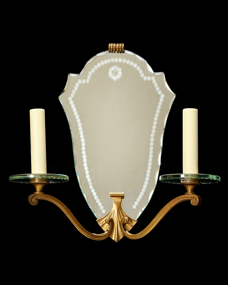 Art Deco etched mirrored back two light sconces with bronze frames and glass bobeches, France circa 1930.