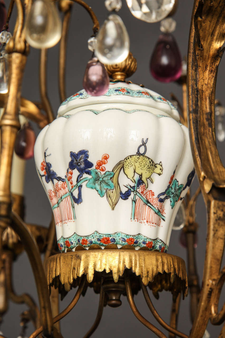 "BAGUES" gilt bronze and tole four light chandelier with porcelain chinoiserie urn and clear and amethyst crystal sprays, France
