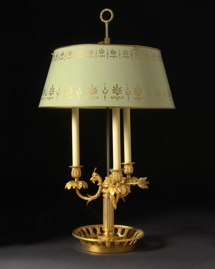 Gilded bronze three light bouillotte with rams head and painted tole shade