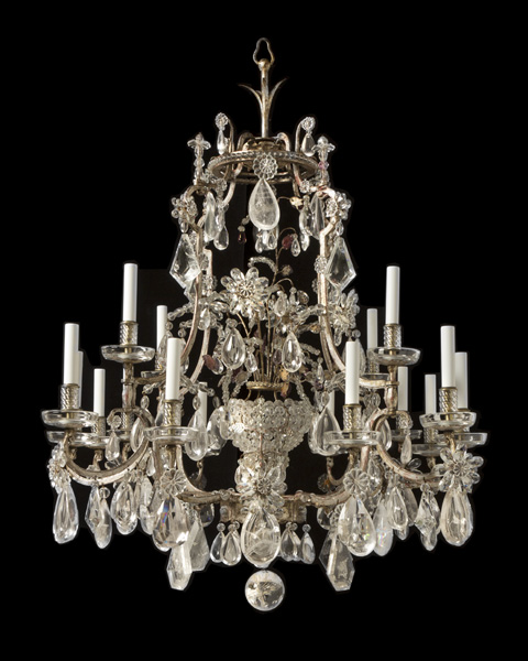 Rock crystal and silvered iron sixteen-light chandelier with bouquet motif by "MAISON BAGUES", France, circa 1920