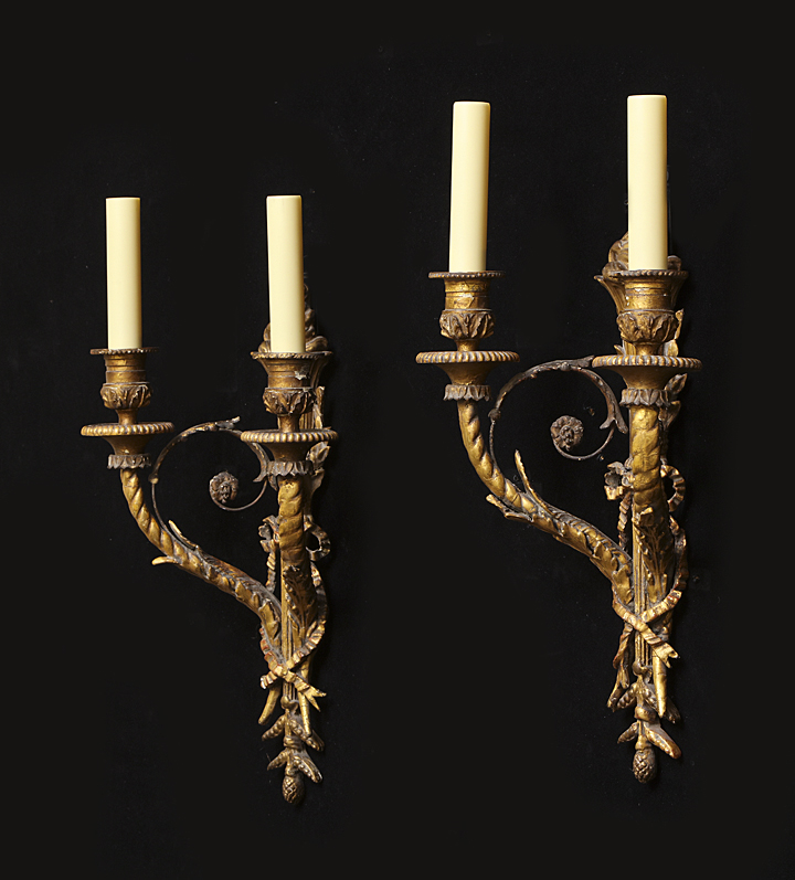 Pair of Louis XV style giltwood, gesso and iron two-light sconces. France, circa 1870