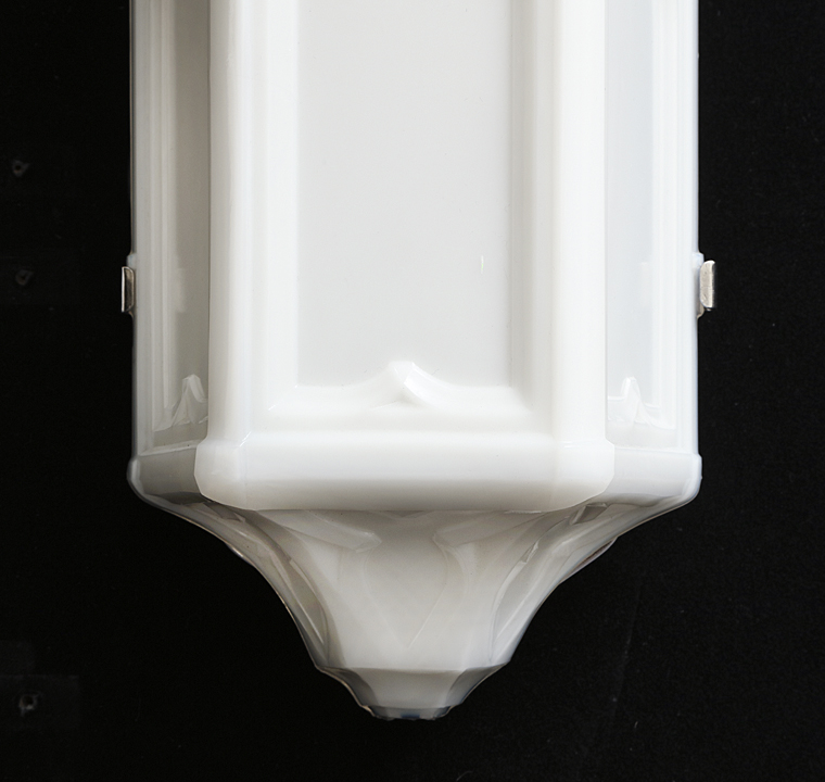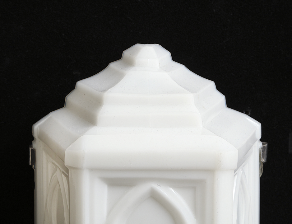 Gothic style Edwardian milk glass sconces, England circa 1900.