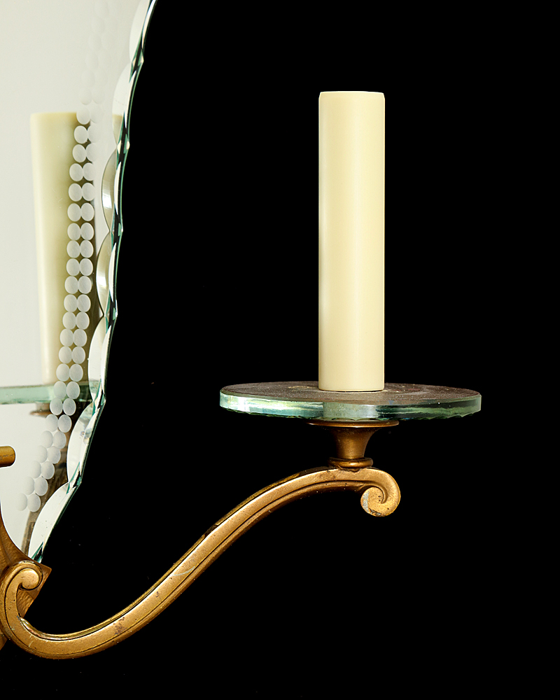 Art Deco etched mirrored back two light sconces with bronze frames and glass bobeches, France circa 1930.