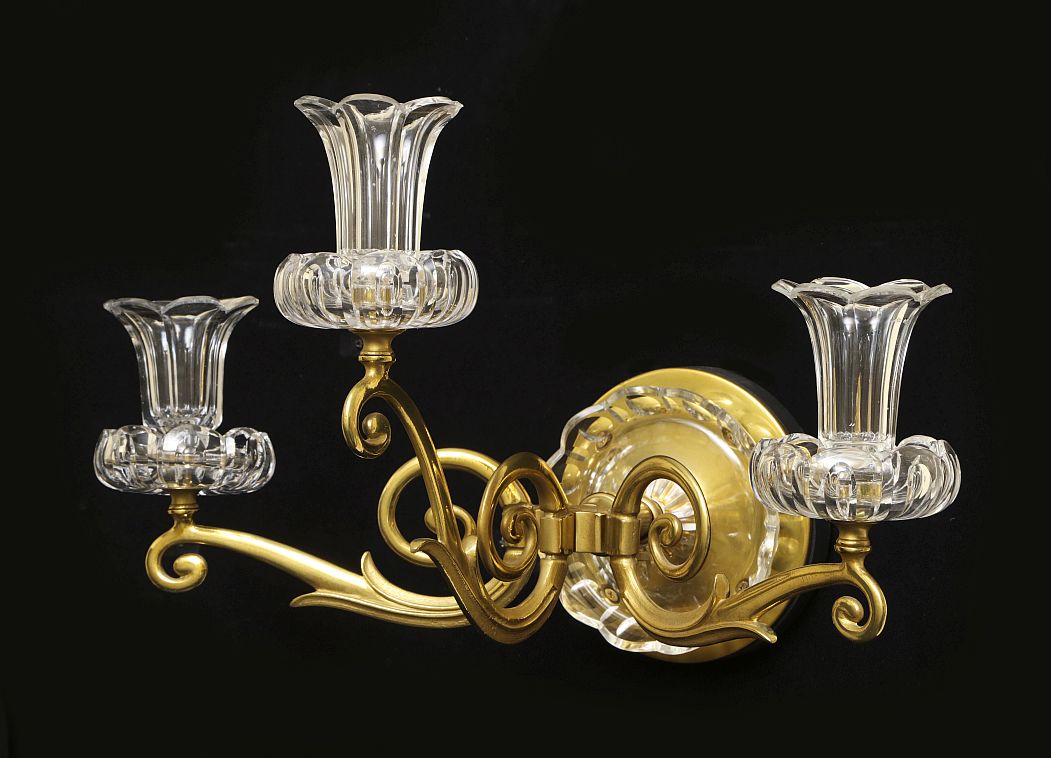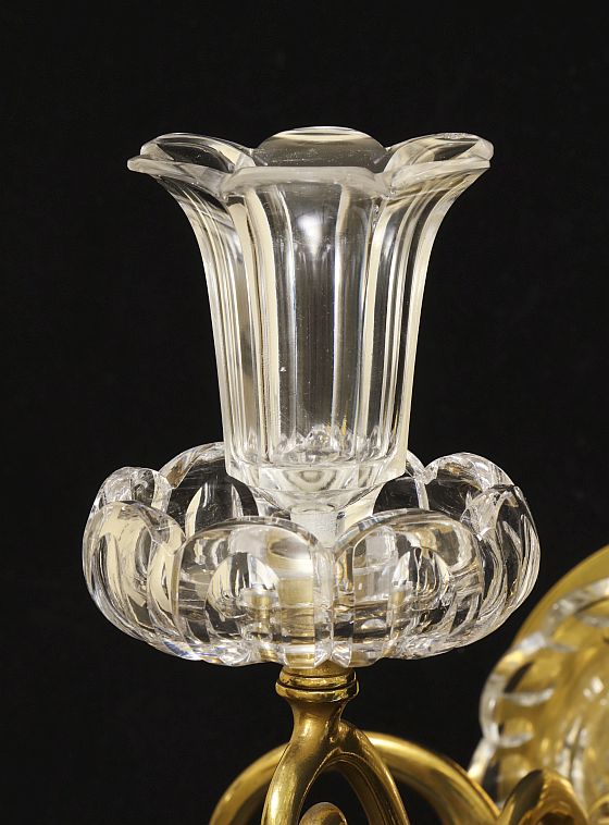 Gilt bronze and cut crystal three light sconces. The arms are scolled with cut crystal candle cups and bobeches. The back plate is bronze with a cut crystal cover, England Mid 19th century.